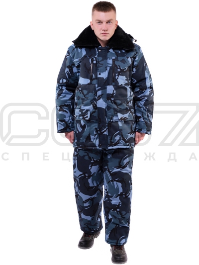 Костюм рабочий зимний охранника "Гарнизон" цв.кмф/синий тк.грета (куртка+пк) в Курске