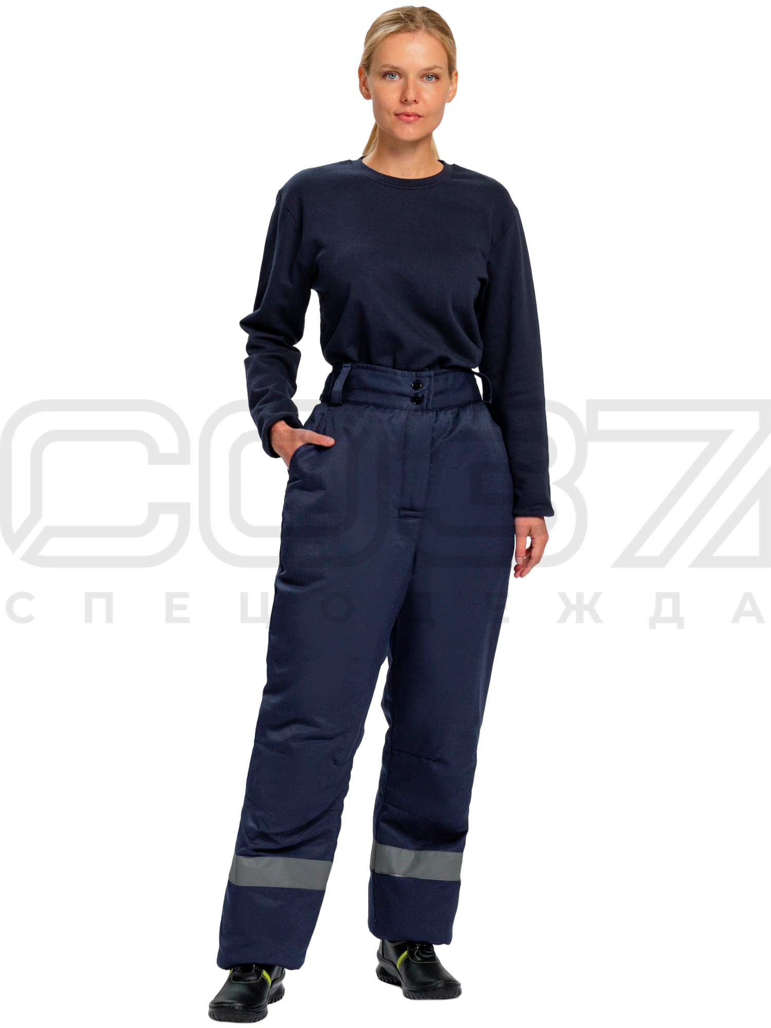- По низу брюк в области голени настрочена светоотражающая полоса шириной 50 мм.